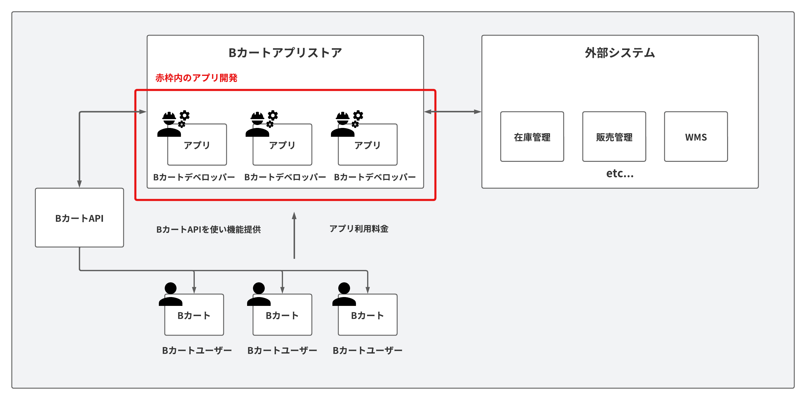 この場合BカートAPIを使ったアプリを開発後、審査を経てBカートアプリストアに公開していただきます。