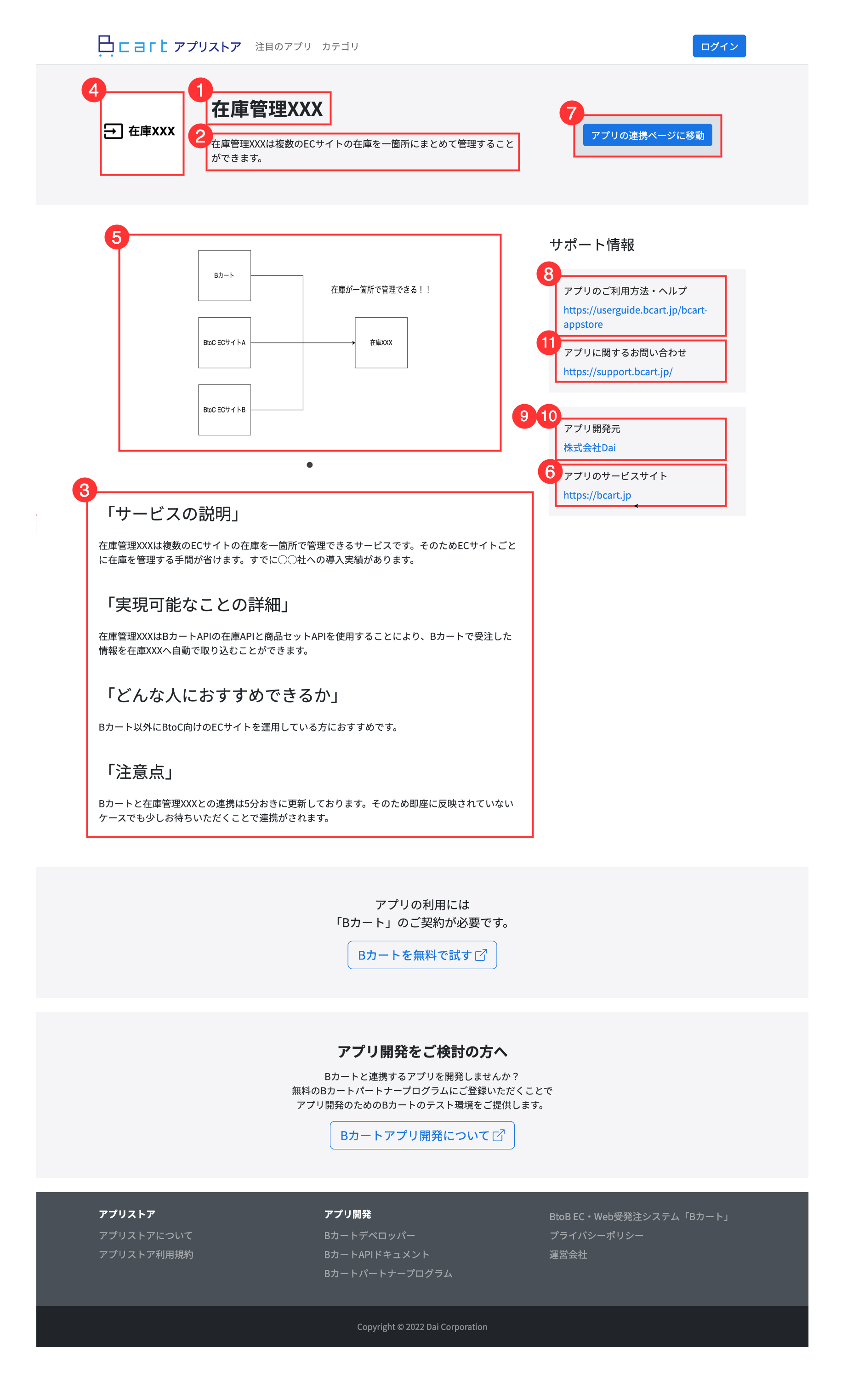 - 開発者側で、提供するサービスとBカートアプリストアの連携手順などを記載したページがある場合設定してください。